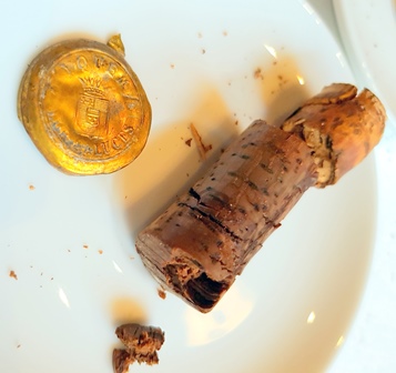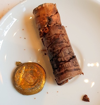 Le quasi de veau est probablement le plat le plus charmeur et goûteux de ce magnifique repas. Le Grand Musigny Faiveley 1906 est un grand vin, doté d’un beau fruit et d’un très joli équilibre. Alors que pour mon goût il est très au-dessus de La Tâche Domaine de la Romanée Conti 1961, c’est paradoxalement La Tâche qui recevra largement plus de votes que le Faiveley. Est-ce la fascination de tout ce qui vient de la Romanée Conti ? Car au moment du service il n’y a plus aucune trace de serpillère ou de lavasse, mais le nez est clairement bouchonné. Or, comme cela arrive assez souvent, le nez de bouchon ne se ressent pas en bouche. Le vin a de la rondeur et une belle expressivité. Mais même s’il n’y a pas l’amertume rêche que donne un goût de bouchon, je ne peux pas aimer le 1961 plus que le 1906. Le plat est divin et aide bien le Musigny.