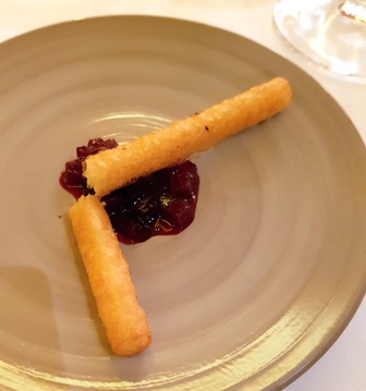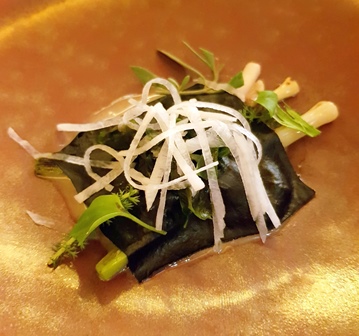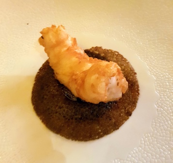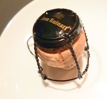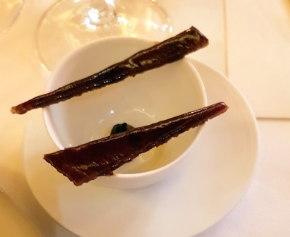 Le Champagne Dom Ruinart magnum  1998 est une très belle surprise car il est épanoui. J’ai toujours du mal à considérer qu’un champagne de 1998 n’est pas un jeune bambin, alors qu’il a vingt ans. Son épanouissement, sa joie de vivre me plaisent. Les amuse-bouches sont d’une diversité extrême et d’un raffinement absolu. Tout le talent de Pierre Gagnaire est déjà exposé dans ces complexités goûteuses. Et le champagne s’en régale.