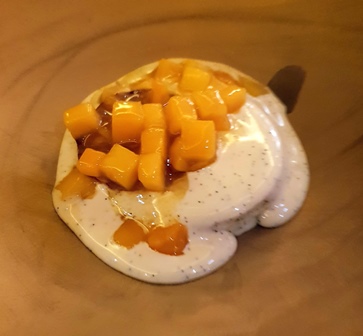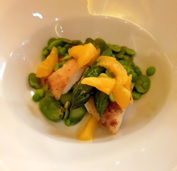 Le menu composé par Pierre Gagnaire et ajusté récemment avec ses deux chefs est : Croquant chocolaté de foie gras de canard, salade de champignons de Paris, velouté Blanc, brioche toastée de palette ibérique, compote de gold rush aux oranges sanguines / Poireau grillé farci de coques et couteaux, pousses d’herbes sauvages des côtes du Croisic, raviole de seiche, navet daïkon / Sole meunière – les filets sont taillés en goujonnettes, fèves, petits pois, pointes d’asperges et nèfles. Soupe verte émulsionnée avec le beurre de cuisson du poisson / Grosse langoustine croustillante 1982 – condiment Dundee-Peecky, galette de blé noir. Une bisque / Cassolette de morilles au curry madras, côtes de romaine, oignons cébettes, pain soufflé farci de ris de veau, lard de Bigorre / Quasi de veau fermier à la Milanaise – purée de carotte au jus | tête de veau / Coffre de canard de Challans enveloppé de poudre de cacao aux aromatiques sous une cloche de chocolat amer – fines aiguillettes laquées d’une bigarade à l’ail fermenté Aomori. Pomme de terre FiFine / Fromage Stichelton / Parfait vanille de Tahiti | mangue jaune / Petits fours et financiers.