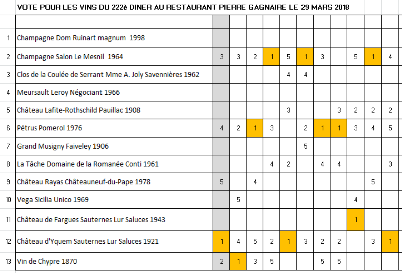Le vote des onze participants pour leurs cinq préférés parmi treize vins n’est pas une chose facile tant les vins sont différents. Selon quels critères peut-on départager Salon 64 Yquem 1921 ? Mais tout le monde a réussi à voter. Une chose me plait énormément : onze vins sur les treize ont eu des votes ce qui montre que onze vins méritaient de figurer parmi les cinq premiers d’au moins un convive. Cinq vins ont eu l’honneur d’être classés premiers. Trois vins ont été classés trois fois premiers : Salon 1964, Pétrus 1976 et Yquem 1921. Deux autres vins ont eu un vote de premier : Fargues 1943 et Chypre 1870.