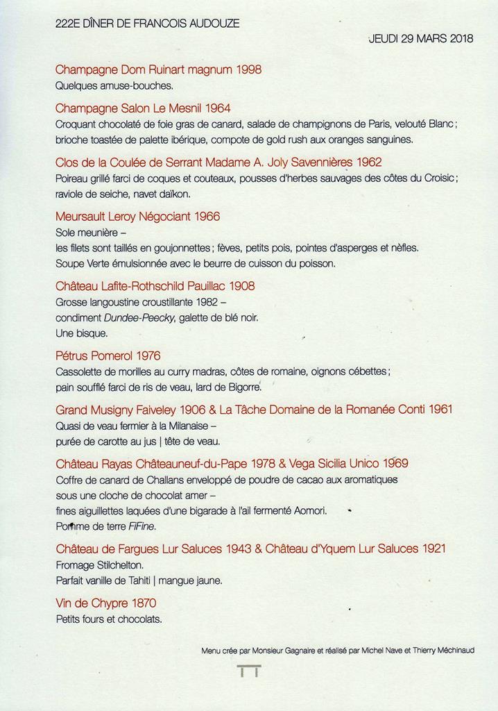 La cuisine que nous avons goûtée, maîtrisée, simplifiée parfois, a été l’une des plus pertinentes que nous ayons connues. Bravo à Pierre Gagnaire mais aussi à toute son équipe. Le service des vins par Logan a été attentif et parfait, le service de table montre une implication intelligente et motivée de toutes les équipes. L’ambiance de la table, joyeuse mais attentive à comprendre les vins et les accords a fait de ce repas aux vins particulièrement prestigieux un des plus beaux des 222 dîners que j’ai eu l’honneur d’organiser avec de grands chefs et de grands vins.