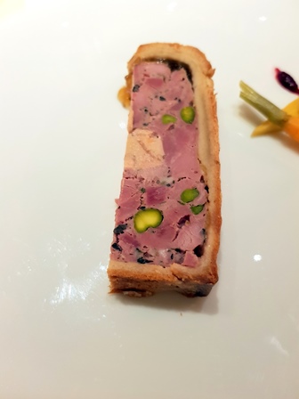 Nous passons à table. Le menu composé par Christopher Hache est : pâté en croûte – légumes / coque – coriandre / homard bleu – bisque / poule – bouillon / sandre – jus de viande / pigeon – farce à gratin / foie gras poché – avocat / stilton / pamplemousse – mangue / financiers / chocolat – déclinaison.