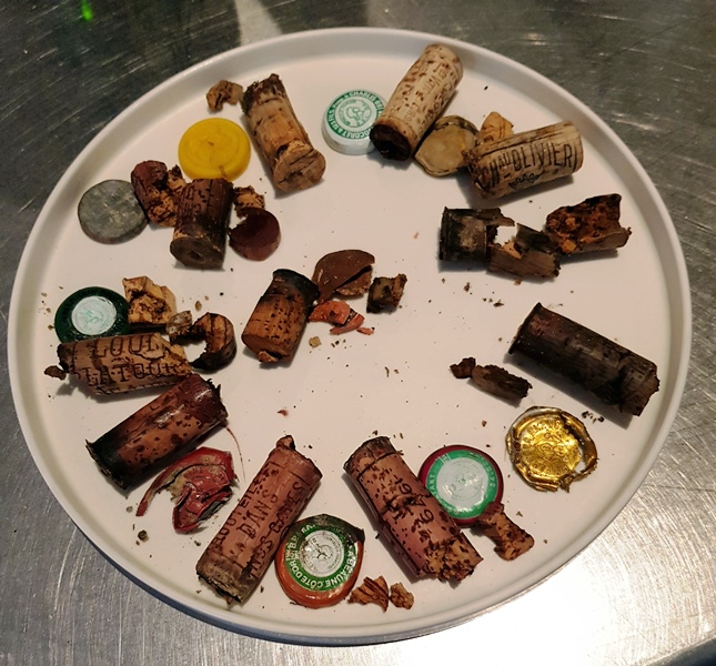 Etant au restaurant à 17 heures j’ouvre les bouteilles et je constate un phénomène curieux. Pour presque tous les vins rouges, des traces noires de lie couvrent le goulot lorsque le bouchon est sorti. Dans d’autres dîners, les bouchons collaient pratiquement tous aux parois de verre du goulot alors qu’aujourd’hui aucun bouchon ne colle au goulot. S’agit-il d’un hasard ou les conditions atmosphériques jouent-elles un rôle ? Il faudra que je vérifie sur de nouveaux dîners si la concordance des comportements des bouchons est le fruit du hasard ou le fruit des saisons. Le seul vin qui pourrait poser un problème est le Chypre 1869 dont le nez est très sec, presque camphré ou glycériné. Le plus beau parfum est celui de La Tour Blanche 1923 ainsi que celui du chablis.