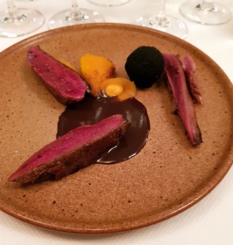 Le pigeon accueille deux vins. Le Gevrey-Chambertin Bouchard Père & Fils 1971 est simple, direct, très doux. Par contraste, le Clos de Vougeot Louis Latour 1971 fait sauvage, canaille, très bourguignon dans l’âme. J’ai tendance à préférer le plus provoquant des deux mais en fait chacun trouve son terrain d’excellence : le Gevrey avec les suprêmes et le Clos de Vougeot avec la farce délicieuse. Il n’y a aucune bataille entre ces deux 1971 et les deux paraissent largement plus jeunes que leurs 47 ans. Le chef Ken m’a fait un beau cadeau car lors du briefing avant le service, l’équipe avait énuméré les plats du repas des autres tables, dont une grouse. J’avais souhaité la goûter et elle fut discrètement ajoutée sur mon assiette. C’est une chair magnifique et vibrante, sans concession, cohabitant sans problème avec le délicieux pigeon.