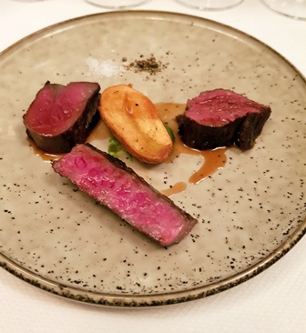 Nous passons à table et le menu est ainsi composé : Risotto aux cèpes et girolles / Saint-Pierre en deux façons, pur et avec un jus de volaille / Homard bleu breton grillé sur le Bincho, bisque avec du comté et du vin jaune / Pigeon de Vendée en deux façons, suprême nature, pattes farcies aux abats et au foie gras / Trois viandes de bœuf de maturation, de Normandie 11 semaines, de Galice 20 semaines et Wagyu Ozaki / Stilton / Cake aux agrumes, suprêmes de pamplemousse poêlés et marmelade de Kumquat / Financiers réglisse et nature.