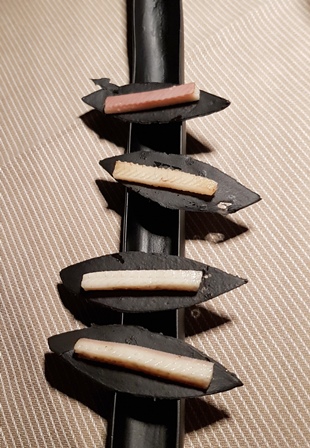 L’apéritif avait été prévu debout mais la fine pluie l’interdit aussi le discours de présentation du dîner se fait tandis que nous sommes assis. J’avais ouvert une heure avant le repas le Champagne Dom Pérignon 1978 et fort curieusement un liquide noir a sali mes mains quand j’ai décollé la cape, et le bouchon lui-même s’est brisé au moment où je l’ai tourné pour l’ouvrir. C’est donc avec un tirebouchon que je l’ai extrait, sans apparition de pschitt. Une telle présentation de la bouteille ne devrait pas exister pour un champagne de cet âge. En bouche, le champagne est agréable, sans être tonitruant. Il n’a pas de défaut mais il n’a pas assez de personnalité. J’avais dit à Akrame pour les amuse-bouches « tu fais ce que tu veux, tu te lâches ». C’est ce qu’il a fait car nous avons aussi bien de l’anguille que des fruits rouges et des saveurs de pamplemousse. Tout est agréable à grignoter.