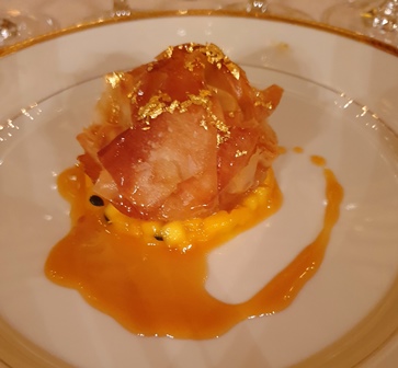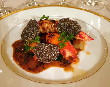 Le Champagne Charles Heidsieck 1955 est comme les deux précédents d’une pureté et d’une précision remarquables. Mes convives se demandent comment il est possible d’avoir trois champagnes aussi anciens, donc à risque, qui se présentent aussi parfaits. Le 1955 est racé, long, avec une personnalité affirmée qui va trouver avec la langoustine et sa gelée d’eau de pamplemousse un accord qui est probablement le plus beau du repas avec celui que l’on aura sur un foie gras poché. La présentation du plat est d’une esthétique remarquable. Le champagne vibre avec la chair de la langoustine servie fraîche mais encore plus avec l’eau de pamplemousse. Et le point final est donné par le caviar mis en valeur par une douce pomme de terre qui donne un coup de fouet au champagne. Des trois champagnes, c’est le Dom Pérignon qui faisait son âge c’est-à-dire une belle maturité, tandis que les deux autres du fait de leur intensité n’ont pas d’âge.