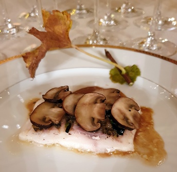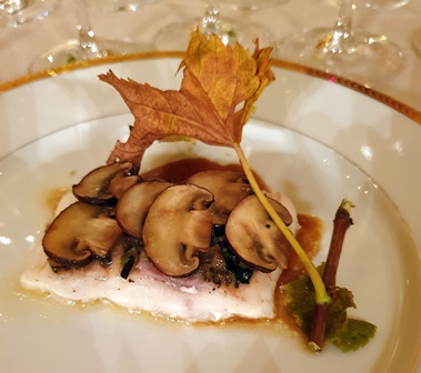 Le bar de ligne aux champignons est accompagné de deux grands bordeaux et beaucoup de convives vont être admiratifs de la pertinence d’un accord qu’ils n’auraient pas imaginé. Le Château Cheval Blanc Fourcaud Laussac 1945 a un nez de truffe d’une puissance extrême et en bouche, il est généreux, puissant, concentré, carré, glorieux et tellement bon qu’on serait prêt à le placer au-dessus du 1947 plus légendaire et plus atypique. Ce vin truffé est une splendeur et je suis heureux d’avoir pu le mettre en présence de celui qui dirige le château Cheval Blanc. Le vin a un tel équilibre qu’il semble indestructible et bâti pour l’éternité.