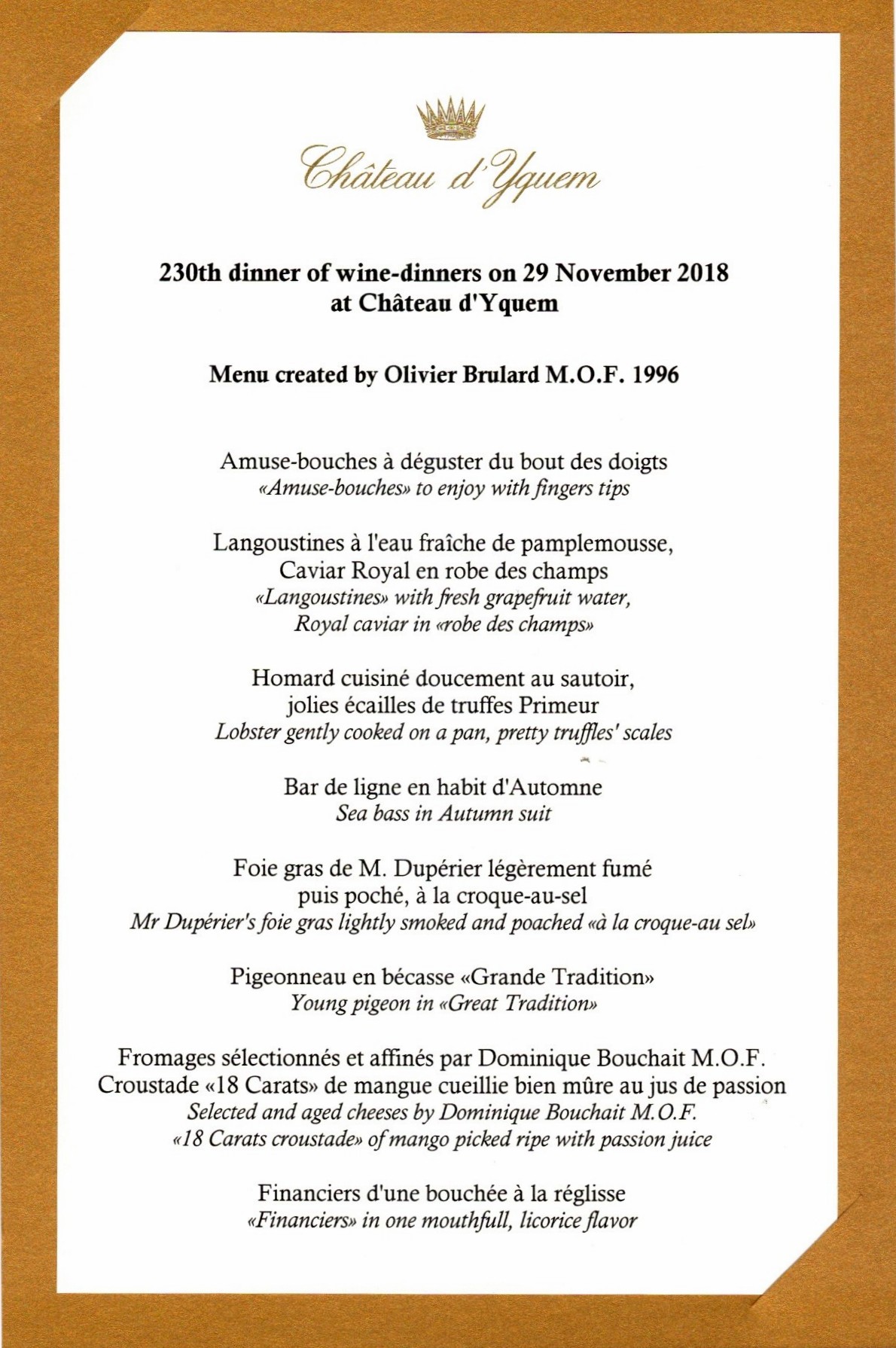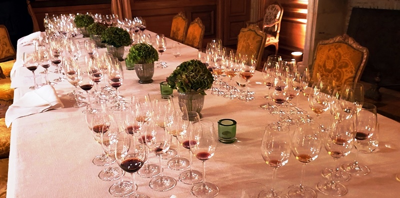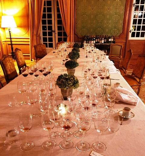 Le rendez-vous du 230ème dîner de wine-dinners est à 18 heures dans le salon le plus ancien du château d’Yquem. Nous serons douze à table, reçus par Pierre Lurton, président d’Yquem et de Cheval Blanc. Notre assemblée de huit hommes et quatre femmes est très cosmopolite avec trois américains de trois villes différentes, Charlotte, Boston et San Francisco, un français vivant à New York, un français vivant à Singapour avec sa femme d’origine japonaise, deux chinois vivant à Oxford, un italien, un allemand et moi. Trois participants étaient au 200ème dîner, trois participants étaient au dîner au siège de Veuve Clicquot. Les deux américaines et les deux chinois ont participé à de très nombreux dîners. Cinq convives participent pour la première fois. Nous nous présentons et Pierre Lurton nous rejoint pour nous souhaiter la bienvenue. Il nous fait visiter les chais et donne rapidement des explications sur le botrytis, la récolte et le vieillissement d’Yquem. Nous allons ensuite dans la jolie salle de dégustation pour goûter trois jeunes Yquem. Leurs couleurs sont très proches et très claires, le 2001 étant à peine plus ambré.