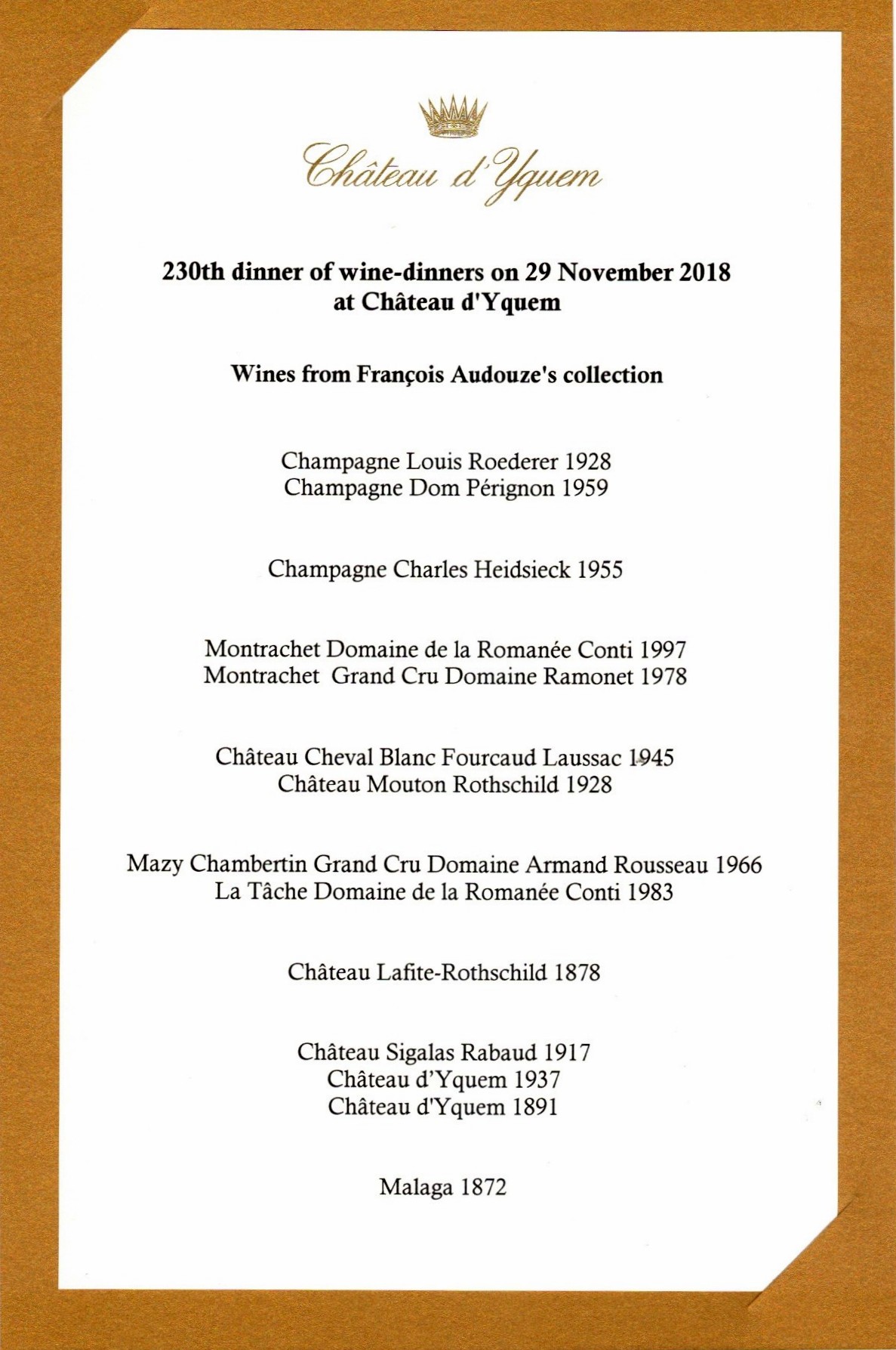 Mon classement est : 1 – Malaga 1872, 2 – Château d’Yquem 1891, 3 – Château Lafite-Rothschild 1878, 4 – Château Cheval Blanc Fourcaud Laussac 1945, 5 – Champagne Louis Roederer 1928.