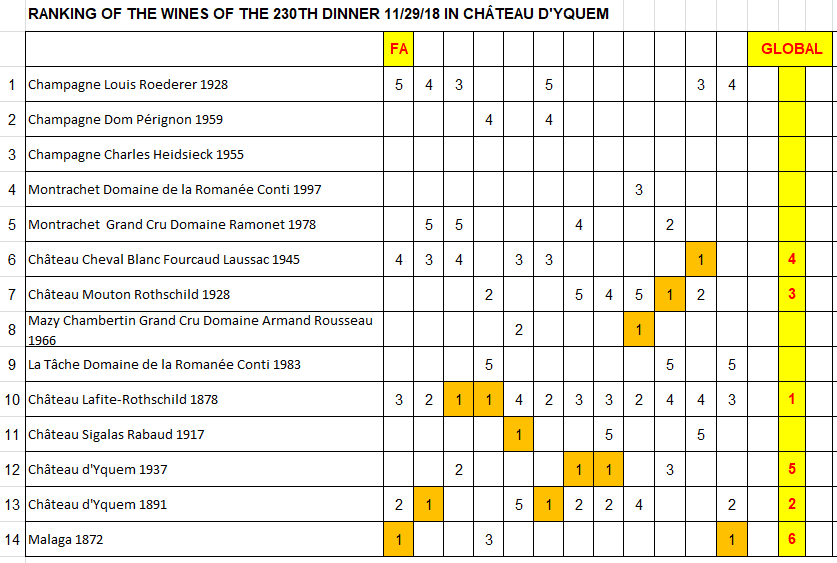 Le classement du consensus serait : 1 – Château Lafite-Rothschild 1878, 2 – Château d’Yquem 1891, 3 – Château Mouton Rothschild 1928, 4 – Château Cheval Blanc 1945, 5 – Château d’Yquem 1937, 6 – Malaga 1872.
