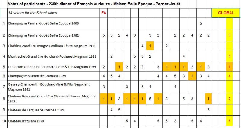 Le vote du consensus serait : 1 – Le Corton Grand Cru Bouchard Père & Fils Magnum 1959, 2 – Château Bouscaut Grand Cru Classé de Graves Magnum 1929, 3 – Champagne Perrier-Jouët Belle Epoque 1982, 4 – Champagne Mumm de Cramant 1955, 5 – Montrachet Grand Cru Guichard-Potheret Magnum 1988, 6 – Château d’Yquem 1970.