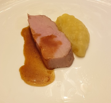 Le veau basse température est divin. Le Champagne Mumm de Cramant 1955 est une merveille de complexité et d’élégance. Il a des intonations de groseilles blanches et son acidité respire sur le veau. C’est un champagne rare par sa diversité et l’accord est d’un naturel qui nous ravit.