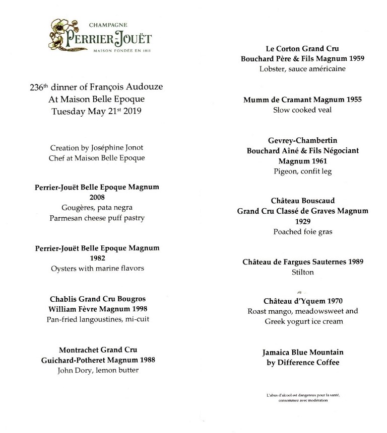 La genèse du 236ème dîner est tout-à-fait particulière. En octobre 2018 j’avais organisé le 228ème dîner au restaurant Akrame à Paris. Le restaurant est étroit et à l’intérieur nous aurions dû avoir une table en longueur ce qui ne me plait pas car trois discussions se forment à des tables très longues. Je préférerais que le dîner se passe dans le jardin, avec une table carrée. La probabilité de pluie est de 40% et le chef de salle accepte cette solution. On couvre la table de parasols et de tentures pour parer à toute éventualité. Au milieu du repas, une tornade se déclare et les tentures en pente déversent des trombes d’eau sur des convives. On se serre dans les parties protégées. Tout cela m’indispose car j’essaie que mes dîners soient les plus parfaits possibles. Je prends la parole et j’indique que tous mes convives seront invités à un nouveau dîner que je leur offre, pour compenser cette mésaventure. Les convives sont heureux, les mouillés comme les secs, et deux convives étant du groupe Pernod-Ricard nous proposent que le dîner de compensation se passe à la Maison Belle Epoque de Perrier-Jouët à Epernay. Une générosité répond à une générosité.