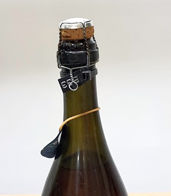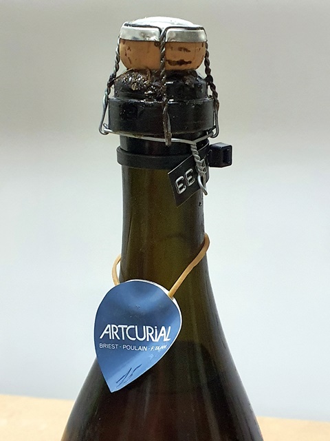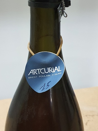 Nous descendons en cave pour que j’ouvre le Champagne Juglar Mer Baltique lot 15 – réf B33 # 1820 qui avait été vendu aux enchères en même temps que le Veuve Clicquot vers 1840. La date est estimée à 1820 car la maison Juglar a cessé de faire du champagne sous ce nom en 1829. Contrairement aux Heidsieck 1907 trouvés dans un bateau en mer baltique qui ont pu garder leur bouchon originel, les champagnes de cet autre bateau ont dû être rebouchés car hors de l’eau les bouchons allaient s’émietter. A l’occasion de ce rebouchage, l’expert mondial Richard Juhlin a goûté chacune des bouteilles et avait donné des notes, 94/100 au Veuve Clicquot vers 1840 et 86/100 au Juglar que nous allons boire. C’est pour cette raison que j’ai pensé ouvrir le champagne assez tard pour éviter qu’il ne se dégrade s’il est d’une moindre qualité.