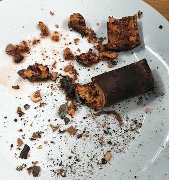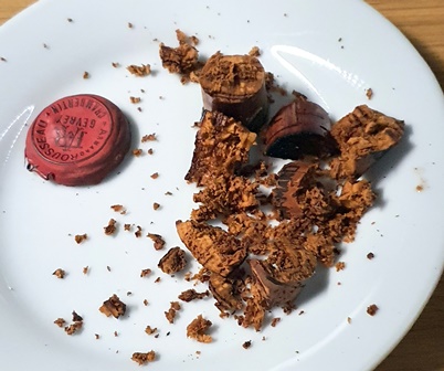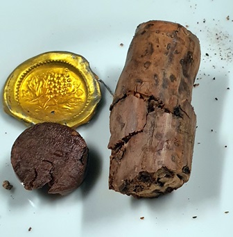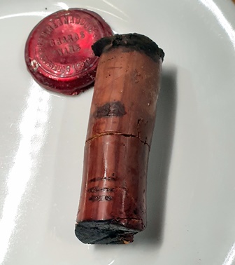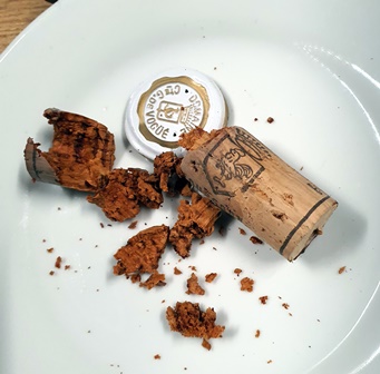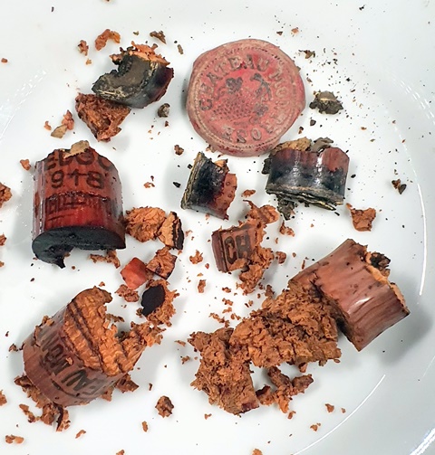 Les vins du repas ont été apportés il y a trois semaines. Le jour venu, c’est à 15h30 que je commence à ouvrir les vins du dîner. Je croyais pouvoir ouvrir le Bourgogne blanc de Vogüé 1995 avec un tirebouchon classique du fait de sa jeunesse, mais une moitié seulement est remontée, le bas du bouchon imbibé ne remontant qu’avec une longue mèche. Le parfum du vin est superbe. Par la suite, beaucoup de bouchons sont remontés en miettes, sauf le bouchon du Haut-Brion probablement de 1880 au liège parfait. Aucun parfum ne me semble rédhibitoire, celui du Haut-Brion me semblant très discret. Faut-il ouvrir le Juglar # 1820 aussi tôt ? Il me semble prudent de l’ouvrir en milieu de repas, juste après avoir bu les bordeaux. Le sympathique sommelier qui est à mes côtés remonte donner l’information en cuisine pour que le chef adapte ses temps de cuissons à cet intermède.