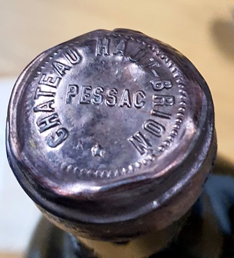 La bouteille du Haut-Brion n’avait pas d’étiquette. A travers le verre foncé, j’avais pu entrevoir les deux « 8 » du millésime et la forme de la bouteille, probablement plus ancienne que 1880 corroborait la période. La capsule superbe indiquait le nom et le bouchon venu entier faisait son âge, ce qui signifie que le vin n’avait jamais été reconditionné.