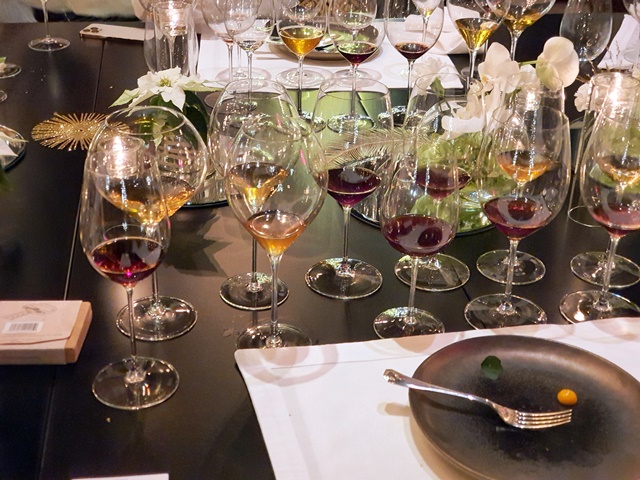 A 19 heures, l’apéritif se prend avec un Champagne Veuve Clicquot La Grande Dame Jéroboam 1990. Le nez de ce champagne est sublime et racé et en bouche il montre une largeur et une énergie superbes. L’ampleur de ce champagne brillant me semble dû au format jéroboam qui lui donne un registre extrême. Mais Didier Mariotti dit que selon lui le format idéal est le magnum et que le jéroboam a moins d’effet. J’avoue avoir du mal à imaginer qu’un magnum offre plus de générosité que ce magistral jéroboam. Ce 1990 est exceptionnel. Les diverses mises en bouche sont variées et excellentes.