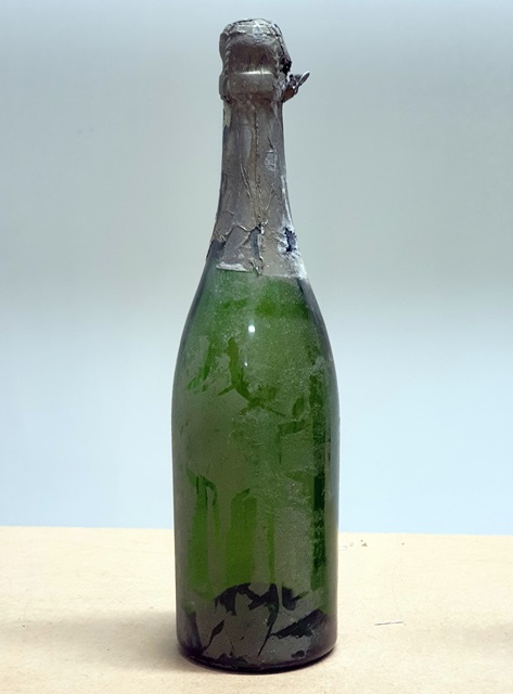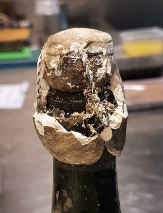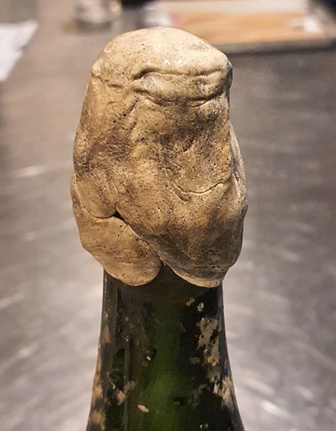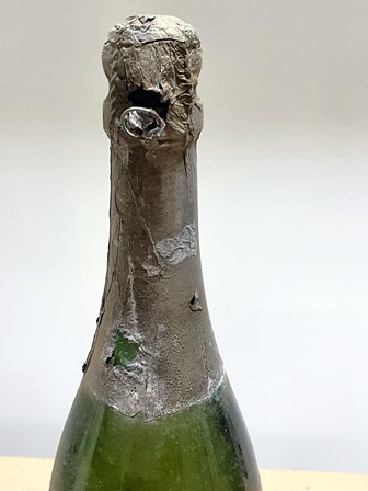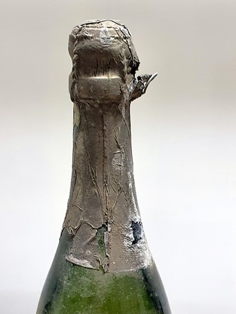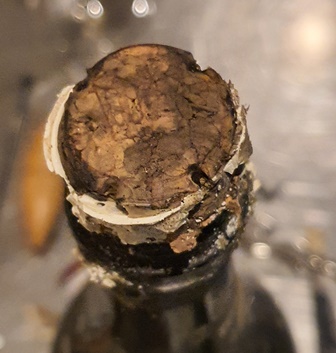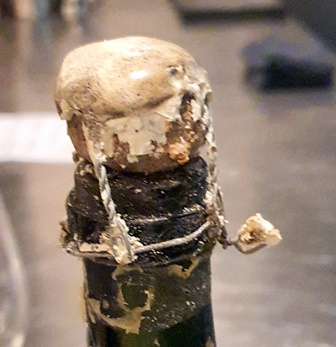 A 18h30 j’ouvre le Krug Private Cuvée et j’ouvre aussi le champagne Heidsieck 1907. La couche de cire qui recouvre le bouchon, mise après la sortie de l’eau de la bouteille en 1998, est tellement épaisse que l’opération me prend au moins dix minutes et je constate que le muselet est récent. On m’avait dit que le bouchon originel avait été conservé. Ça me paraît plausible, le bouchon étant d’un très beau liège.
