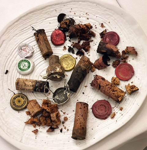 Je me présente peu après 16 heures au restaurant pour ouvrir mes vins. Matthieu, l’excellent sommelier est resté à mes côtés pendant cette opération et c’est agréable pour moi de pouvoir discuter et sentir les vins en échangeant nos impressions. Il n’y a pas eu trop de difficultés, mais comme souvent les bouteilles anciennes ont un goulot qui n’est pas cylindrique. S’il est pincé, il est impossible de tirer le bouchon sans qu’il ne se déchire en de nombreux morceaux. Ce fut le cas pour le Haut-Bages Libéral 1928 dont le parfum m’a séduit par son extrême complexité, presque aussi beau que le parfum du Latour 1928. Le parfum de la Romanée Conti 1967 est strictement ce que l’on peut attendre, avec des évocations de sel et de rose. Le nez le plus puissant est celui du Meursault 1990. L’Yquem 1906 a un bouchon qui a été changé dans les années 60. Le parfum de ce vin est assez discret mais d’une grande suavité.
