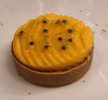 Le Château d’Yquem 1906 est d’une belle couleur ambrée. Son parfum n’est pas tonitruant mais a toute la complexité d’un grand Yquem. L’accord avec le stilton est naturel. Yuki, la jeune pâtissière, a fait une délicieuse tarte où la mangue est rafraîchie par un jus de fruit de la passion, qui excite bien l’Yquem. J’ai dit à Ken que si l’on refait ce plat il faudrait enlever les grains de fruit de la passion pour ne conserver que le jus.