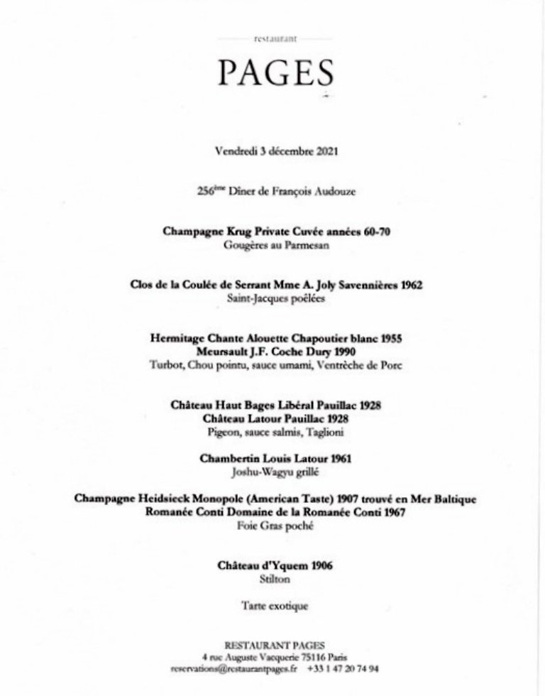 Le menu conçu par le restaurant Pages et son chef Ken est : gougères au parmesan / Saint-Jacques poêlées / turbot, chou pointu, sauce umami, ventrèche de porc / pigeon sauce salmis, Taglioni / Joshu-Wagyu grillé / foie gras poché / stilton / tarte exotique mangue et fruit de la passion.