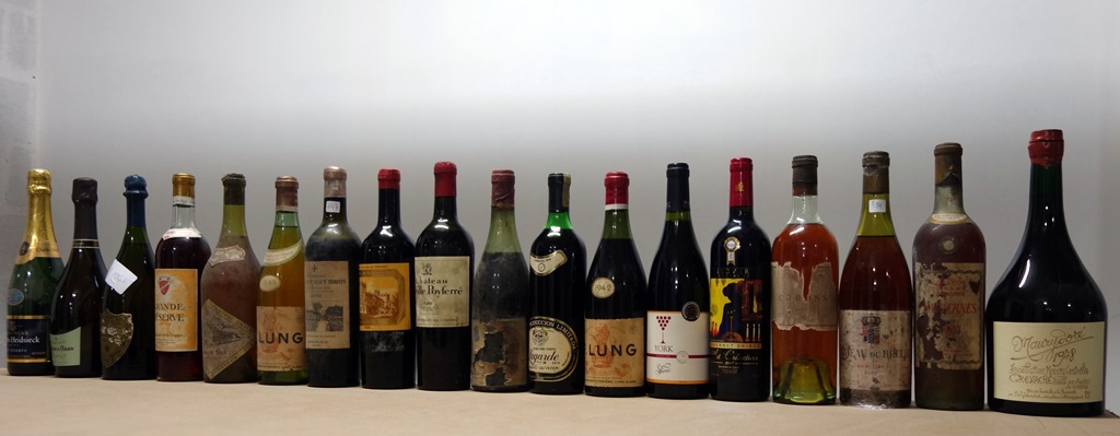 Groupe 1 : Champagne Charles Heidsieck mis en cave en 1997, Champagne Legras et Haas Exigence n° 8 Grand Cru Vieilles Vignes base 2009, Champagne Dom Pérignon 1966, domaine de la Trappe de Staouëli Grande Réserve vin fin rosé Alger 1957, Côtes du Jura Fruitière Vinicole de Voiteur 1959, Frédéric Lung blanc Algérie 1947, Château La Mission Haut-Brion 1936, Château Ducru Beaucaillou 1934, Château Léoville Poyferré 1929, Morgon Namun de Marcy 1961, Bogeda Lagarde Cabernet Sauvignon Reserve , Mendoza Argentine 1974, F. Lung Frédéric Lung rouge Alger 1942, Vin d’Inde York Shiraz 2012, Vin d’Inde Grover Vineyard cabernet Shiraz 2011, Cérons 1919, Chateau du Breuil Coteaux du Layon 1953, Sauternes 1931, Maury Grenache Fruitière Vinicole de Maury 1960 #, Maurydoré Paule de Volontat magnum 1948.