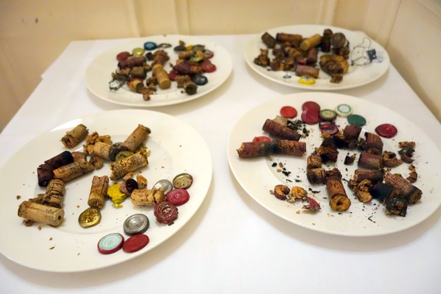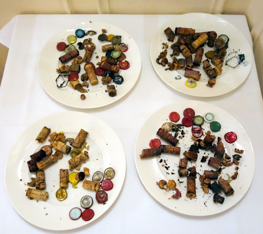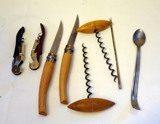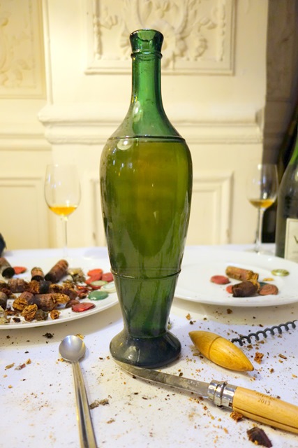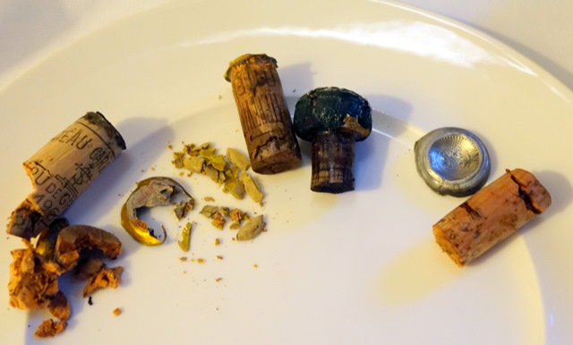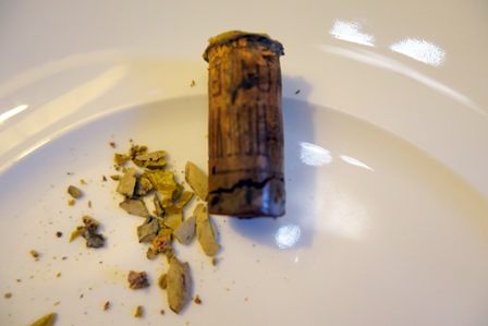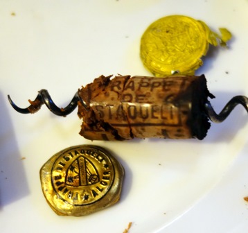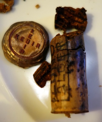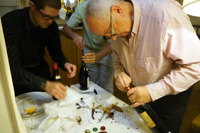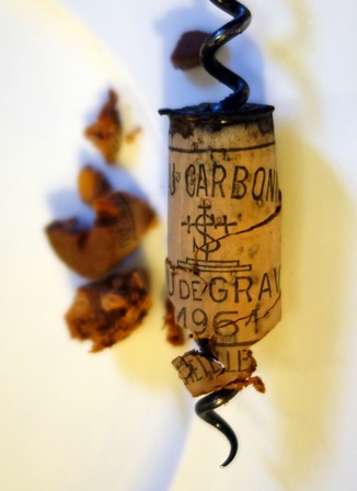 Quelques bouteilles n’avaient pas été livrées et arrivent au dernier moment, ce qui ne devrait pas se produire. Elles sont ouvertes. Au cours de ces opérations de débouchage il y a classiquement des bouchons qui se brisent en mille morceaux et quelques uns qui plongent dans le liquide au moment où le tirebouchon veut se piquer. Il faut alors carafer le vin et enlever le bouchon pour que le vin reprenne sa place dans la bouteille.