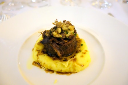 L’apéritif se prend debout. Une bouteille de Champagne Charles Heidsieck mis en cave en 1997 n’a plus de bulle et le vin est passé. Deux autres sont superbes, leur vin agréable et fluide se buvant comme un vin de soif. Le Champagne François Giraux Brut sans Année est un peu plus dosé, plus carré. C’est un champagne sans histoire. A l’inverse, le Champagne Palmer & Cie Blanc de Blancs 1985 est d’un vivacité extrême. C’est un champagne qui exprime la joie de vivre, de belle facture.
