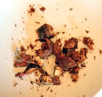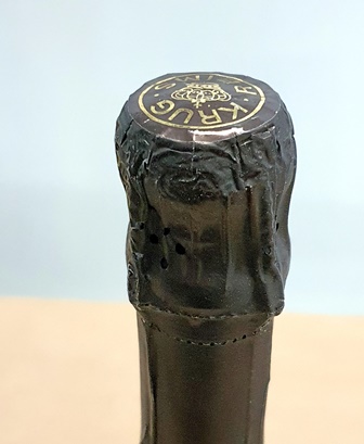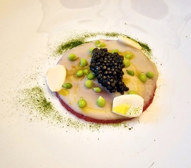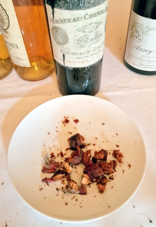 Le Champagne Krug Vintage 1982 est d’une délicatesse exemplaire. Il est doux, calme, subtil, mais son calme apparent cache une belle puissance et une impériale complexité. Je suis conquis par ce champagne facile à vivre et à ma grande surprise le Selosse recevra beaucoup plus de votes que le Krug, ce qui me rend heureux car cela prouve que mes convives n’ont pas été rebutés par le caractère sauvage du Selosse. Et c’est bien ainsi. L’amuse-bouche avec des morceaux de seiche est délicieux avec le Krug.