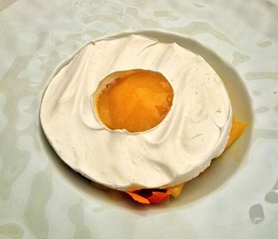 Le Stilton est de belle qualité et forme avec le Château Coutet Barsac 1958 un très bel accord. Le vin est d’une douceur extrême, rose et fraîche. C’est avec la mangue que l’accord est absolument parfait. C’est la plus grande émotion instantanée de ce repas que cet accord d’anthologie. Le vin est tout simplement charmant. Le sorbet n’est pas en continuité avec la chair pure de la mangue. La meringue par son caractère sucré crée une belle excitation du Barsac.