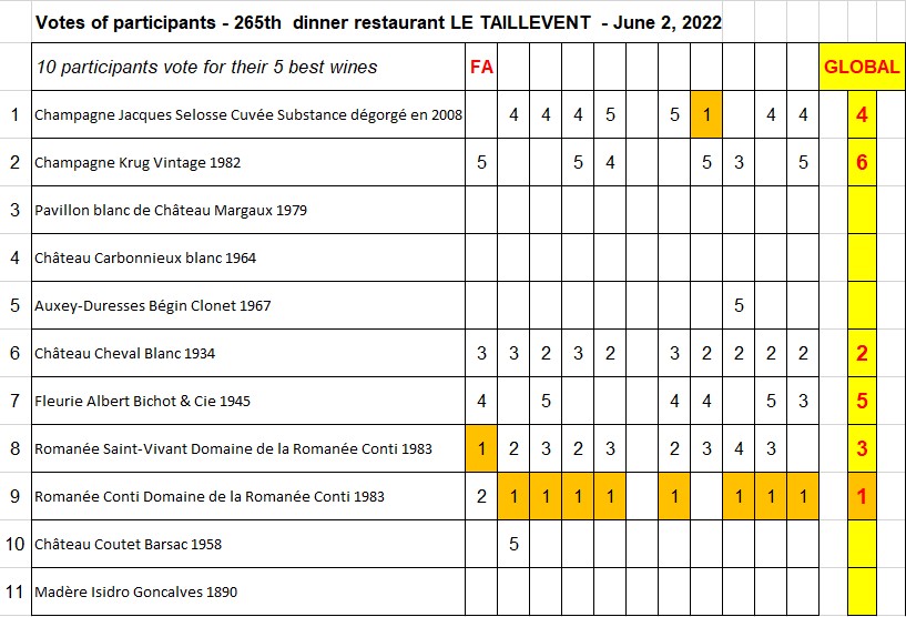 Le vote global de la table est : 1 – Romanée Conti Domaine de la Romanée Conti 1983, 2 – Château Cheval Blanc 1934, 3 – Romanée Saint-Vivant Domaine de la Romanée Conti 1983, 4 – Champagne Jacques Selosse Cuvée Substance dégorgé en 2008, 5 – Fleurie Albert Bichot & Cie 1945, 6 – Champagne Krug Vintage 1982.
