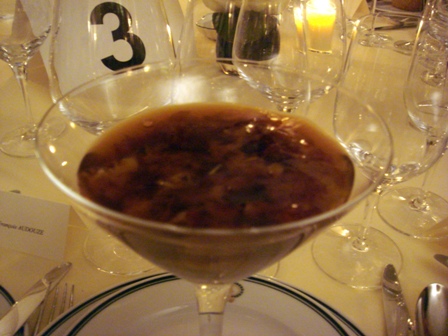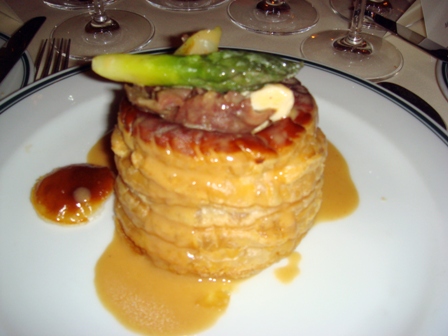 La photo de gauche montre que j’étais à la table 3, et que j’y étais ! (voir mon nom). L’araignée, institution du restaurant Laurent est traitée pour mettre en valeur le champignon. Pour chacun des présents, le vol-au-vent a rappelé des souvenirs d’enfance.