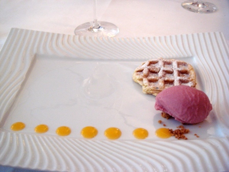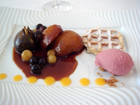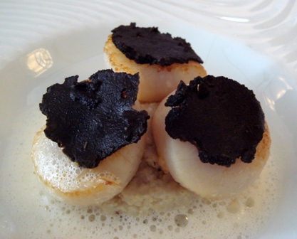 L’entrée de tourteau sur haricots coco et pelures d’oignons n’est pas très équilibrée, car le haricot envahit le palais, ce qui ne favorise pas l’accord avec le vin. A l’inverse, les coquilles Saint-Jacques juste poêlées avec une belle tranche de truffe sont exquises. Et le vin s’en donne à cœur joie, nous offrant une plénitude assez rare pour un vin de cette année. Le dessert aux fruits des vendanges est plaisant. Le service et la cuisine de ce restaurant sont à signaler.