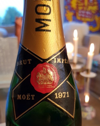 Le Champagne Moët & Chandon Brut Impérial 1971 a un bouchon de belle qualité qui vient assez facilement. Le pschitt est faible mais le pétillant est là. La couleur est d’un orange à peine rosé. La bulle est presque absente. Le nez est pur d’un champagne vineux où l’alcool est contenu. En bouche, ce qui apparaît immédiatement est le confort et le plaisir. Ce champagne est précis, doux, velouté, évoquant des fruits oranges, comme la couleur du vin, tels la pêche et l’abricot. Tout en ce champagne est sympathique. Il est confortable, rassurant. Bien sûr il n’a pas la complexité des champagnes plus typés mais il a une cohérence et une fluidité qui en font un champagne de vrai plaisir. C’est un plaisir franc et direct que nous offre ce Moët. Il y a un peu de râpe, liée à l’alcool, mais c’est le fruit doux et doucereux qui est porteur de plaisir. Sa seule limite est une légère monotonie dans un message un peu trop constant. Ma fille l’a beaucoup aimé ce qui est le principal.