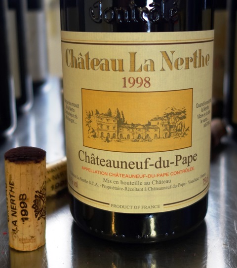 Le Châteauneuf-du-Pape Château de la Nerthe rouge 1998 a une couleur qui n’est pas très nette. Le nez est celui d’un vin déjà évolué. Il a une belle attaque généreuse avec une belle minéralité. Dans le final il y a un petit côté tisane et fumé qui signe un vin qui commence à évoluer.