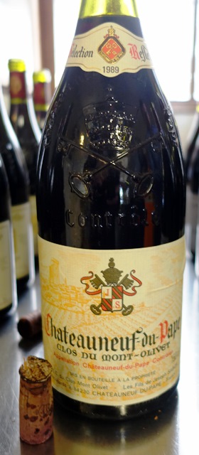 Le Châteauneuf-du-Pape Clos de Montolivet rouge 1989 a une couleur un peu tuilée. Le nez est un peu fatigué. Il y a beaucoup de matière, le vin est riche aux tannins très présents. C’est une cuvée tradition.