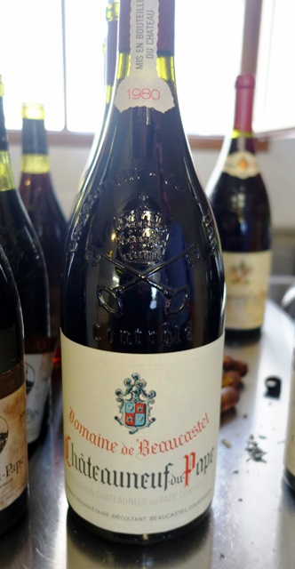 Le lendemain matin, à 9h30 je me présente au réfectoire de l’école maternelle du village où des vignerons et des sommeliers ouvrent et préparent les bouteilles qui seront dégustées à partir de 11 heures à l’atelier « déclinaison de vieux millésimes de Châteauneuf-du-Pape au fil des âges ». C’est Kelly Mac Auliffe, un sommelier américain à la carrure de rugbyman qui mène les opérations. Il décante les vins deux fois, une première fois dans une carafe à décantation pour écarter la lie, et une deuxième fois en remettant le vin dans sa bouteille. On est très loin de la « méthode Audouze », mais cela n’a pas une importance déterminante puisque les vieux millésimes sont encore de jeunes vieux.