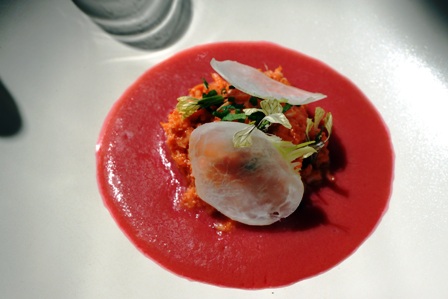 Nous avons été servis très vite de l’entrée dont le coulis de cerise masque un peu le caractère marin du beau tourteau. J’ai demandé que le poisson ne vienne pas trop vite pour que nous profitions du champagne. Plus d’une demi-heure plus tard, ne voyant rien venir j’ai demandé où on en était et on m’a expliqué que l’on lance les plats par vagues successives et que nous avions manqué deux vagues.