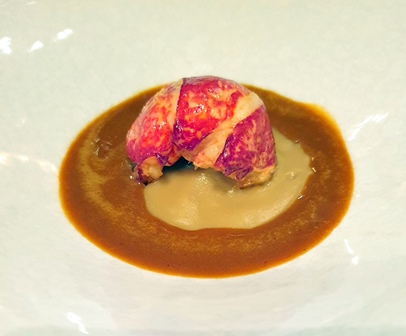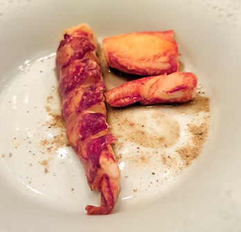 Le Champagne ‘Perfection’ Jacquesson 1961 est beaucoup plus marqué par l’âge. Il faut s’acclimater à ses goûts tertiaires et alors le miracle se produit grâce à la gelée du tourteau qui donne un coup de jeune au champagne qui devient délicieux. C’est, je crois, le plus bel accord du repas, Alain Pégouret étant depuis toujours le prince des tourteaux.