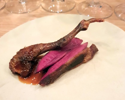 Le canard est associé à deux bordeaux, l’un de la rive gauche, Château Brane-Cantenac 1962 de l’appellation Margaux et l’autre de la rive droite, Château Clinet 1967 de l’appellation Pomerol. Le 1962 est d’une solide charpente, débordant de saveurs truffées. Le Clinet est plus discret, plus en suggestions. Il s’efface un peu devant le Margaux conquérant qui s’est approprié la belle chair du canard.