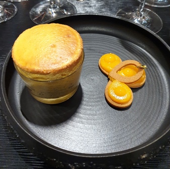 Le Château Guiraud Sauternes 1893 est d’une bouteille ancienne superbe, n’a pas d’étiquette mais la capsule et le bouchon renseignaient sur son nom et sur son année. Le niveau dans la bouteille était presque dans le goulot. Sa couleur est plutôt claire, tendant vers le rose. Son parfum est infini. On peut dire que c’est un sauternes parfait, d’une année mythique. Le soufflé est absolument divin. Un détail est amusant. Lorsque j’étais venu il y a une semaine vérifier certains plats avec le chef, j’avais eu l’opportunité de goûter cet excellent soufflé. Mais il était copieux. Aussi avais-je demandé au chef de réduire la taille du soufflé. Ce qui fut fait. Mais un des convives ayant adoré ce plat a demandé s’il pouvait en avoir un peu plus et toute la table a eu un deuxième service du soufflé. Le chef avait donc vu juste lors de mon essai. L’accord Guiraud et soufflé est divin.