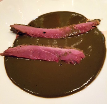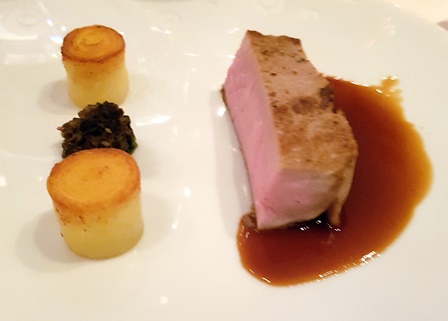 J’ai apporté La Tâche Domaine de la Romanée Conti 1992. Nous avions bu avec nos deux amies au dîner d’il y a deux jours La Tâche 1961 qui n’était pas parfaite. Ce vin est une belle revanche. Le vin est beaucoup plus puissant que ce que laisse entendre son millésime et il exacerbe joliment les qualités du domaine de la Romanée Conti. Hervé Brousse, qui dirige le restaurant dans la continuité de ses parents et à qui je fais goûter le vin, trouve dans ce 1992 des aspects d’une Romanée Saint-Vivant du domaine. J’avoue que je suis plutôt sur le terrain d’une belle La Tâche, dont les complexités sont ciselées. Le filet de biche est exactement ce qu’il faut pour mettre en valeur La Tâche.