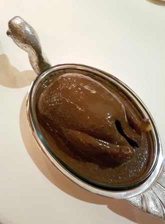 The little madeleines with honey are to die for. Champagne Dom Ruinart rosé 1990 with the nice bottle is unfortunately corked. If we accept to drink champagne, forgetting the bitterness created by the cork, there is a very significant freshness that champagne offers. But it is useless to insist.