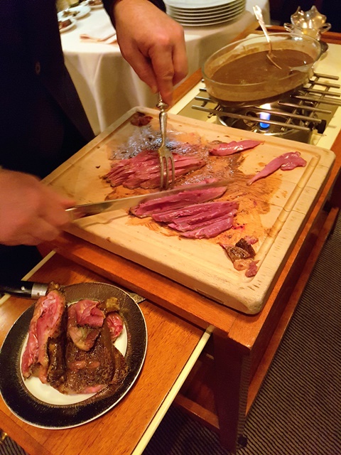 I go down in cellar to bring up the three wines already open since about six hours that will accompany the meat. Taking in hand La Tâche 1957, the horrible smell at the opening is always present and my verdict is that the wine will be undrinkable. I bring back the wines and I announce the death of 1957.