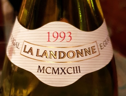 J’ai apporté avec moi un vin qui est une curiosité. La bouteille est magnifique, avec des textes très longs sur une étiquette très belle avec des dorures. Il s’agit d’un Vin Nature Laurent Perrier qui au goût est très difficile à situer. Je le verrais dans une plage de temps assez large, des années 20 jusqu’aux années 50.