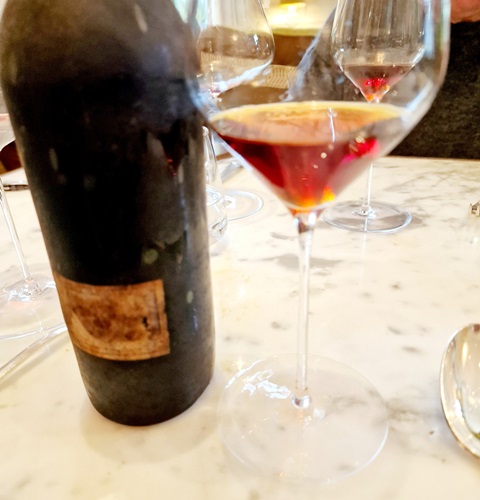 Le Clos Adélia Vin fin d’Algérie 1949 est totalement exceptionnel. Il est large puissant, expressif et intense et à le boire on prend conscience que c’est un vin de la plus haute élite. Dominique pense qu’il pourrait se confronter à tous les plus grands vins français de 1949. Il se trouve que j’avais bu un Clos Adélia 1948 que j’avais trouvé totalement exceptionnel. J’ai la même sensation avec ce vin grandiose. Ce vin est presque noir tant il est riche.