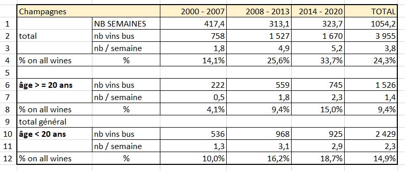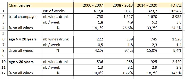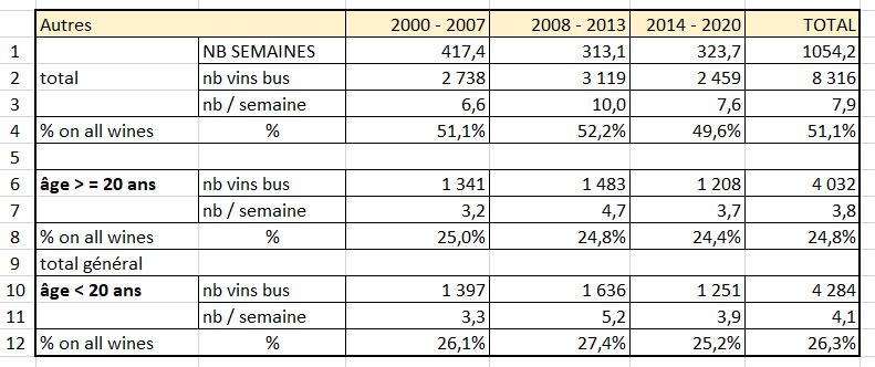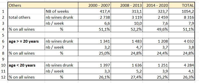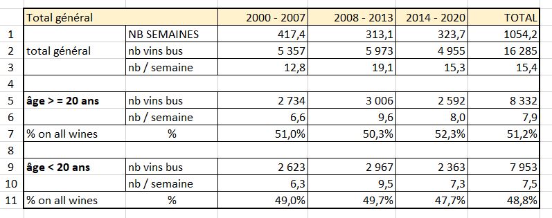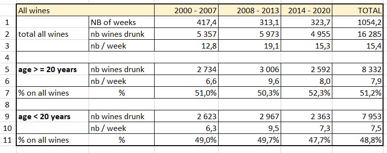 Let’s first look at general consumption in three periods: 2000 to 2007, 2008 to 2013 and 2014 to 2020 (as of March 15). These are periods of 417 weeks, 313 weeks and 324 weeks, of which the numbers of wine drunk are fairly close: 5357 – 5973 – 4955 (line 1).