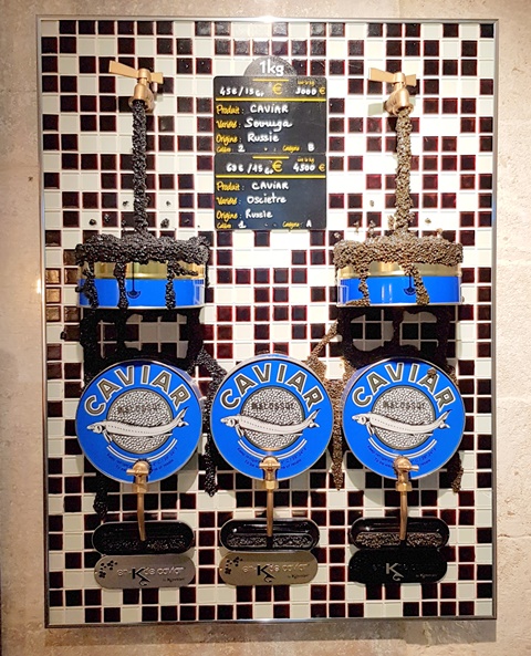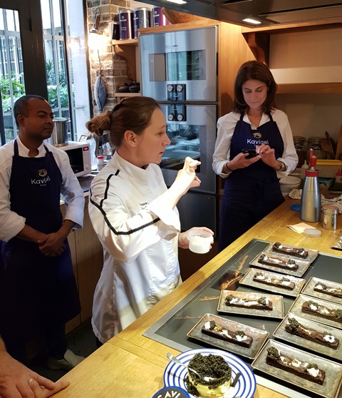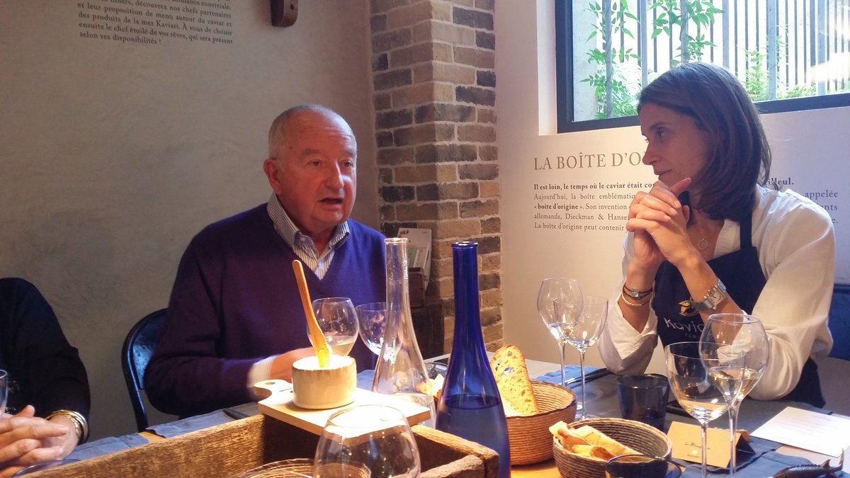 Pendant l’été, nous avions été de fidèles clients du restaurant La Promesse à Ollioules tenu par Valérie Costa que je connais depuis environ dix ans, lors de sa participation à l’un de mes dîners. Je reçois un mail dont le texte est simple : « Je cuisine le caviar chez Kaviari, à la manufacture rue de l’Arsenal ». Nous répondons favorablement à cette sympathique invitation, sans savoir vraiment ce qui va se passer, et ma femme et moi nous nous présentons dans le 4ème arrondissement à la Manufacture Kaviari dont la devanture est d’une grande discrétion. Il y a juste en façade un esturgeon recroquevillé qu’on ne reconnaît que si l’on fait attention. Lorsqu’on passe la porte il y a un bureau avec de charmantes personnes et on se demande si c’est bien là. Je prononce le nom de Valérie Costa. Les sourires s’éclairent et on nous montre la direction d’un très long couloir. Nous arrivons dans une pièce dont la décoration moderne évoque les pays scandinaves. Ma femme pense immédiatement à Noma le célèbre restaurant danois. Tout ici est joli, accueillant et sympathique. Valérie et son mari Jean Marc nous saluent. Valérie est au fourneau, avec les ingrédients qu’elle va marier ce midi et deux imposantes boîtes de caviar trônent sur le plan de travail, l’une de caviar Kristal qui est relativement clair et l’autre de caviar Osciètre Prestige, beaucoup plus foncé.