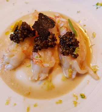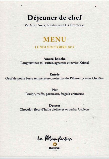 Le menu composé par Valérie Costa est : langoustines mi- cuites, agrumes et caviar Kristal / œuf de poule basse température, noisettes du Piémont, caviar Osciètre / poulpe, truffe, parmesan, fregola crémeuse / chocolat, fleur d’huile d’olive et or, caviar osciètre.